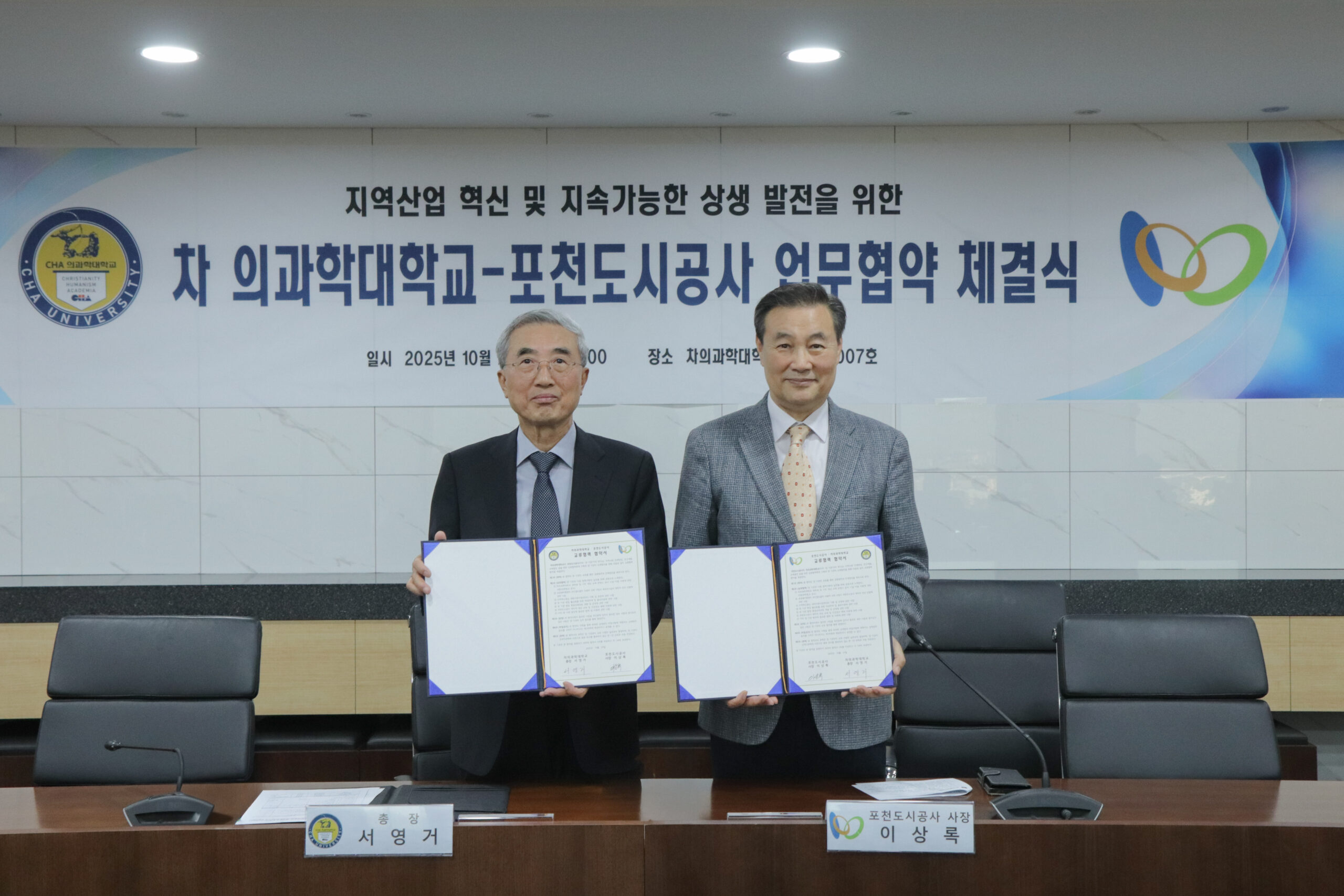 차의과학대학교(총장 서영거)와 포천도시공사(사장 이상록)가 10월 27일 차의과학대학교 미래관에서 지역사회 인재양성과 교육 발전을 위한 업무협약(MOU)을 체결했다.